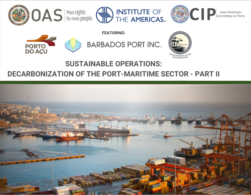| On Nov. 25th, the Secretariat of the Inter-American Committee on Ports (CIP) of the Organization of American States (OAS), in collaboration with the IOA co-hosted the second webinar in our series on sustainable operations of the maritime-ports sector. Experts from Barbados Port Inc., Port of Açu, in Brazil, and the National Port System Administration (ASIPONA) of Manzanillo, Mexico presented successful practices that catalyze the decarbonization of the sector through electrification, digitalization, and alternative fuels. We had around 170 participants from more than 20 countries from the hemisphere and beyond. For more information on this and our discussion from last April, click here. |